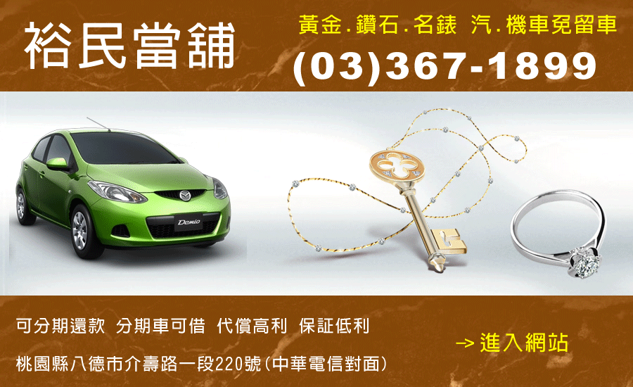 為合法的桃園當舖專門辦理汽車借款、機車借款、借錢、借貸、票貼、二胎、3C產品、名錶與鑽石GIA等精品各項借款,是您桃園資金周轉的好夥伴。工商融資新管道,全力支援您財富人生,馬上放款專線,免聯徵免保人專員貼心諮詢,專業合法經營當